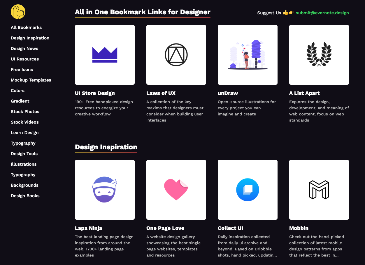 All in One Bookmark Links for Designer Posted on January 18, 2019June 7, 2024 by gleam A collection of the best links for designers, you can also submit your own link. https://www.evernote.design/